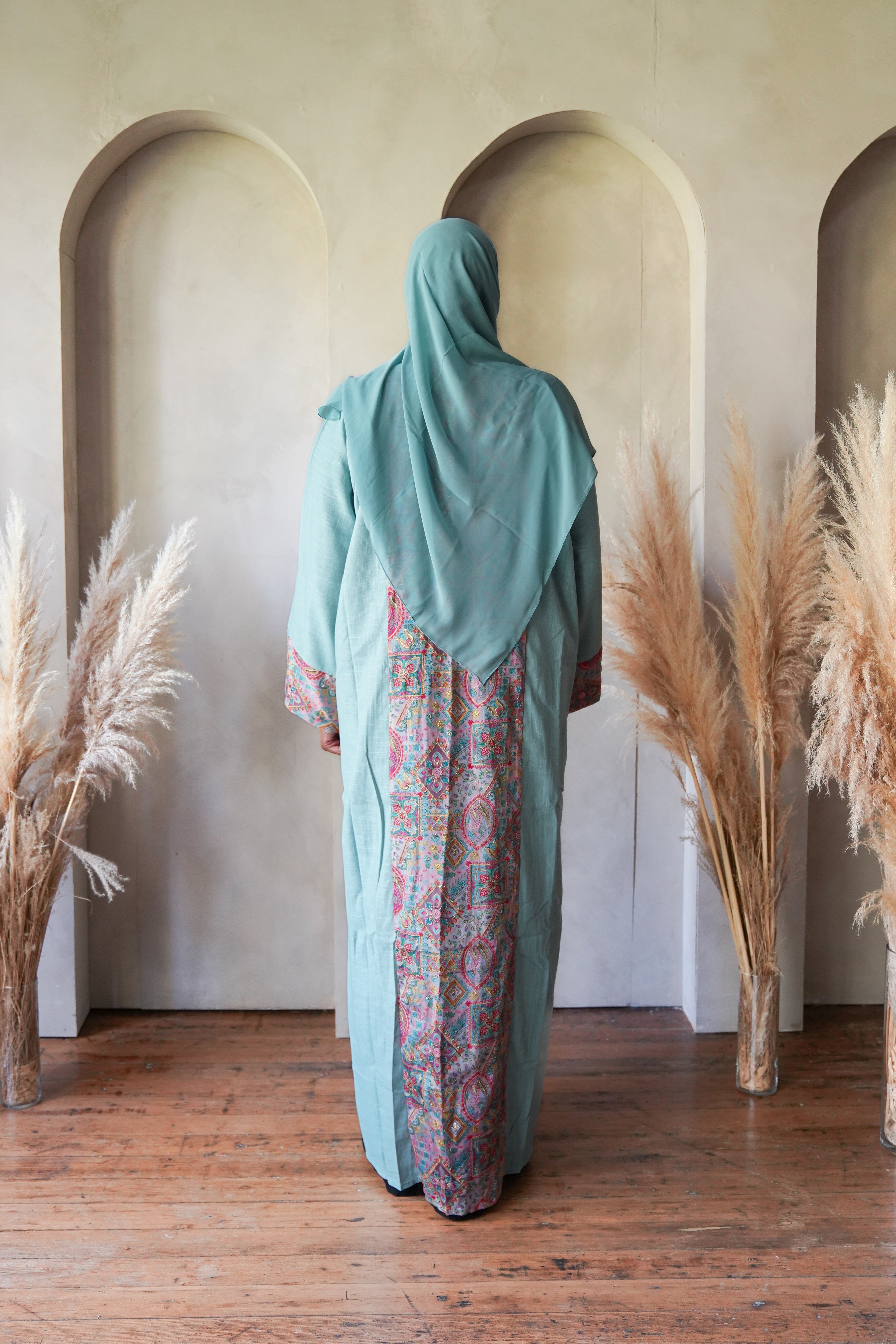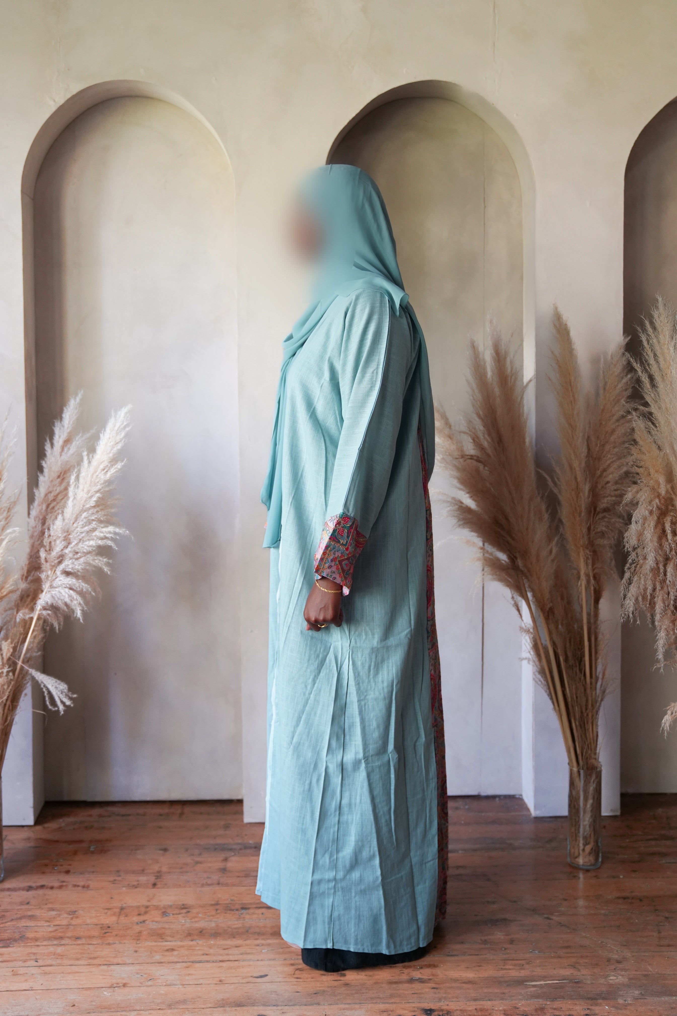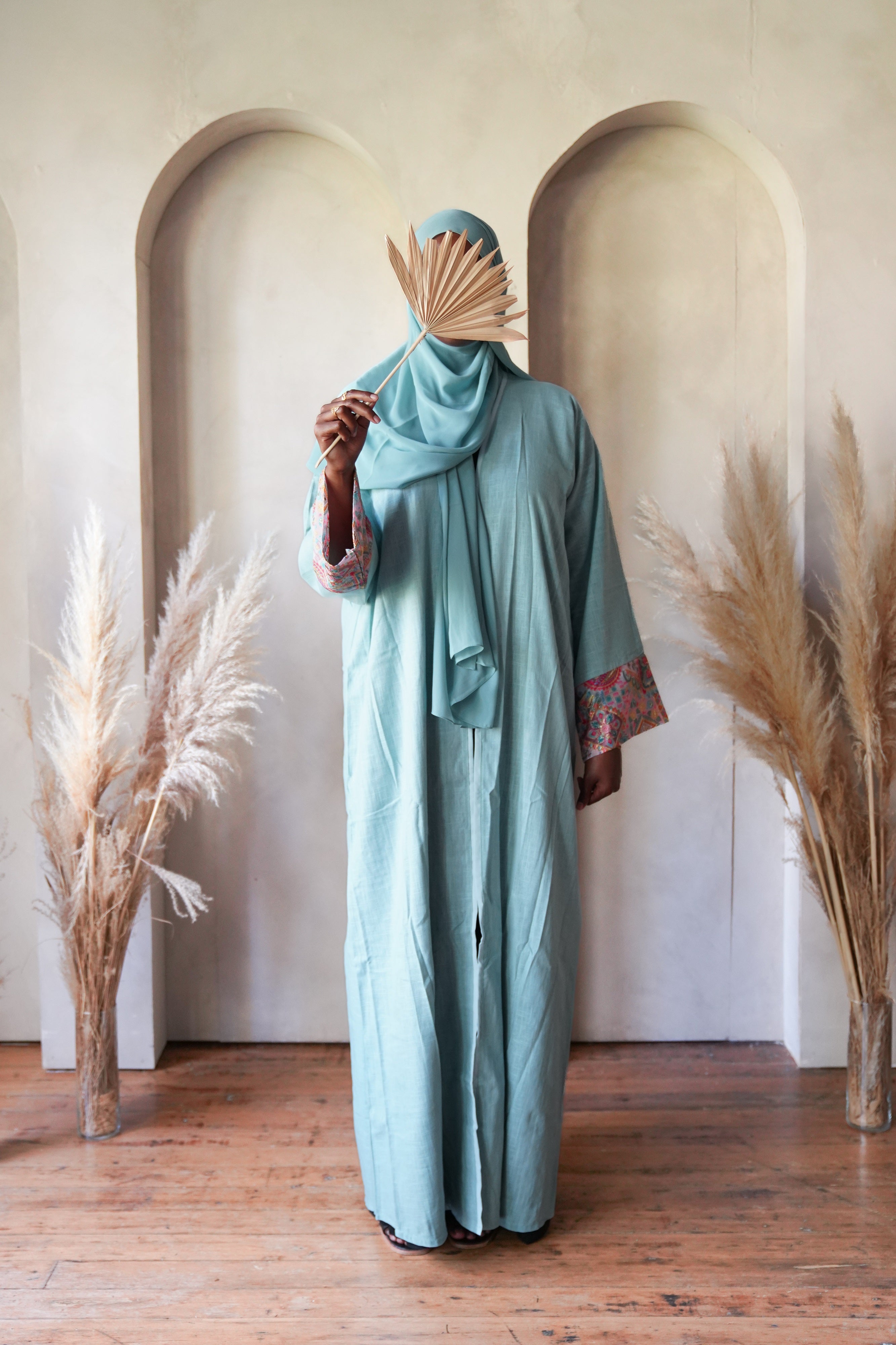 Inspired by serene ocean hues, the Teal Yūgen Abaya adds a refreshing pop of color to your wardrobe. Its lightweight fabric and modern cut make it ideal for layering across seasons.