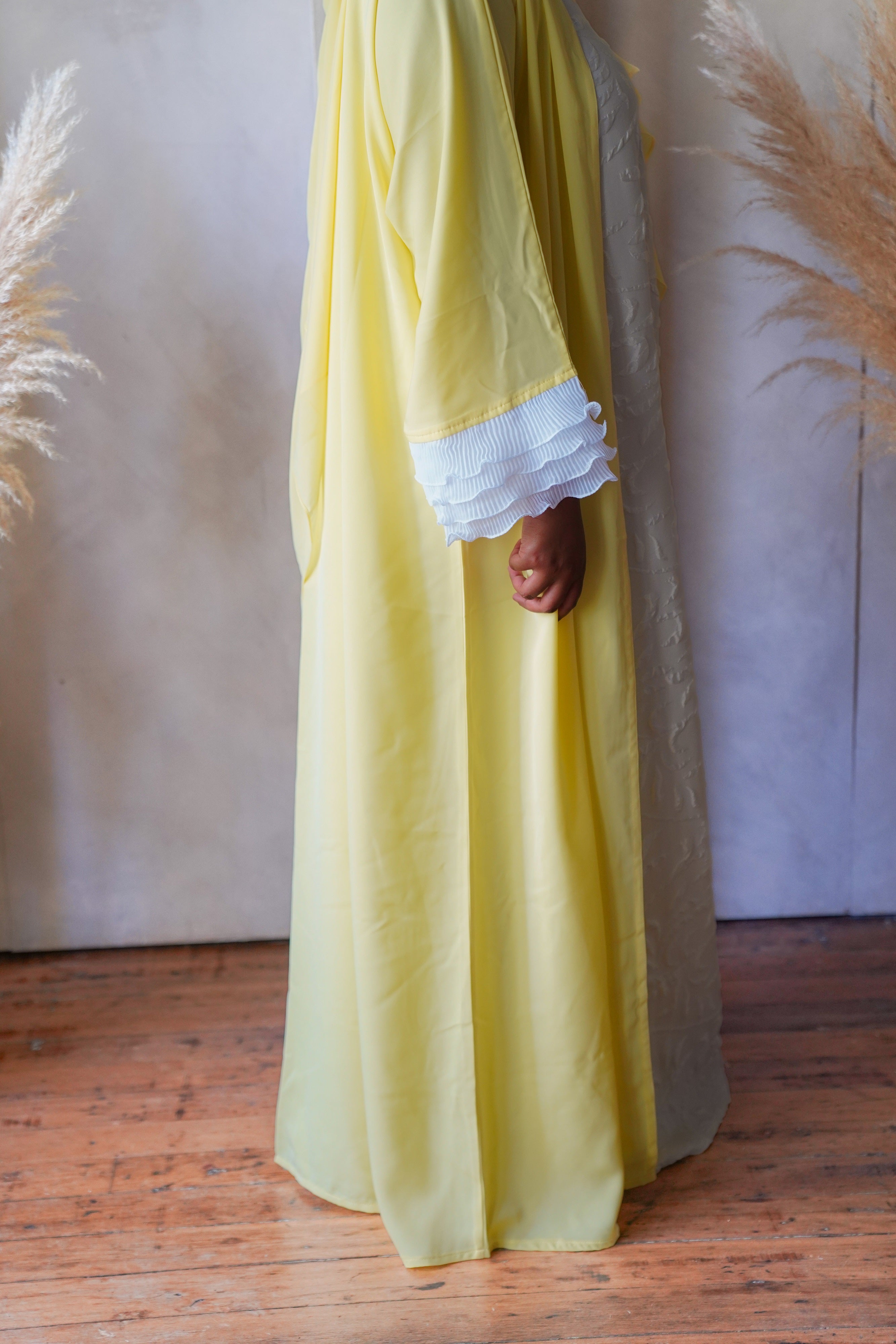 Playful yet refined, the Yellow Ruffle Abaya features cascading ruffle sleeve details that move beautifully with every step. A bold piece for days you want to stand out.